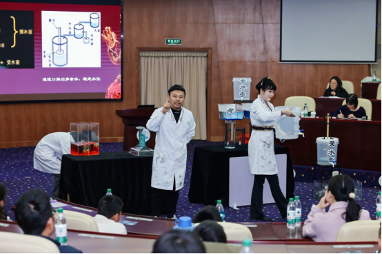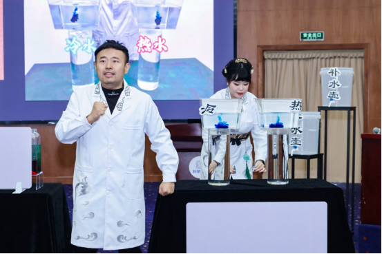 活动伊始,浙江省科技馆的金牌科普辅导员团队带来了一场轻松有趣的科学实验秀。从古代沈括的“漏刻”计时,到现代连通器原理的实际应用,辅导员们通过观察冷热水中色素的变化、不同水位的液体压强等现象,生动展示了科学与生活的紧密联系,引得现场小朋友惊呼连连。